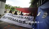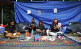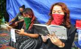 Massa perempuan Piknik Melawan membaca buku saat menggelar aksi kreatif di depan Gerbang Pancasila Gedung DPR/MPR RI, Jakarta, Senin (21/4/2025). Aksi kreatif ini digelar dalam rangka memperingati Hari Kartini sekaligus menyuarakan bentuk perlawanan terhadap militerisme dan patriarki, dua wajah dari satu tubuh kekuasaan yang sama yang kerap menyasar perempuan lebih dahulu. (FOTO : Republika/Prayogi)
