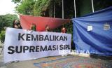 Massa perempuan Piknik Melawan menggelar aksi kreatif di depan Gerbang Pancasila Gedung DPR/MPR RI, Jakarta, Senin (21/4/2025). Aksi kreatif ini digelar dalam rangka memperingati Hari Kartini sekaligus menyuarakan bentuk perlawanan terhadap militerisme dan patriarki, dua wajah dari satu tubuh kekuasaan yang sama yang kerap menyasar perempuan lebih dahulu. (FOTO : Republika/Prayogi)
