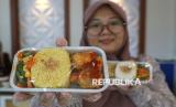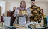 REPUBLIKA.CO.ID, ACEH -- Petugas penyedia makanan memperlihatkan contoh hidangan untuk jamaah calon haji Aceh selama penerbangan di Asrama Haji Embarkasi Aceh, Banda Aceh, Aceh, Selasa (22/4/2025).