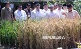 REPUBLIKA.CO.ID, BANYUASIN -- Presiden Prabowo Subianto didampingi Inisiator Gerakan Indonesia Menanam (Gerina) Ustadz Adi Hidayat, Menteri Pertanian Andi Amran Sulaiman, Menteri Desa dan Pembangunan Daerah Tertinggal (Mendes PDT) Yandri Susanto, Utusan Khusus Presiden Bidang Ekonomi dan Perbankan Setiawan Ichlas meninjau kebun padi apung usai peluncuran Gerina di Desa Sungai Pinang, Kecamatan Rambutan, Kabupaten Banyuasin, Sumatera Selatan, Rabu (23/4/2025).
