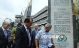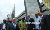 Para delegasi dari negara-negara Asia Afrika bersama Wali Kota Bandung Muhammad Farhan melihat Monumen Dasasila Bandung saat Historical Walk peringatan 70 tahun Konferensi Asia Afrika, di Jalan Asia Afrika, Kota Bandung, Rabu (23/4/2025). Dalam acara tersebut 20 delegasi mengunjungi sejumlah titik tempat bersejarah di kawasan Jalan Asia Afrika hingga Alun-alun Kota Bandung. (FOTO : Edi Yusuf)