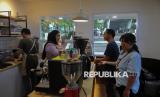 Pekerja difabel berbincang di kafe Difabis di kawasan Terowongan Kendal, Jakarta, Sabtu (26/4/2025). Kafe Difabis yang didirikan oleh koperasi difabel dan didukung oleh Pemprov DKI Jakarta serta Baznas DKI Jakarta tersebut memberikan kesempatan bekerja bagi difabel. Kafe tersebut telah menyerap tenaga kerja kelompok difabel sebanyak 21 orang yang tersebar di tujuh titik kafe Difabis. Dalam sehari, mereka mampu menjual sebanyak 130 gelas minuman dengan harga beragam mulai dari Rp18 ribu hingga Rp25 ribu. Keberadaan kafe tersebut menjadi salah satu contoh bagi pelaku usaha dalam menciptakan peluang bisnis yang inklusif dan ramah difabel. (FOTO : Republika/Thoudy Badai)