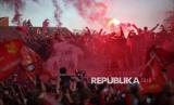 Pendukung Liverpool berkumpul saat merayakan gelar Liga Primer Inggris 2024/2025 di kandang sendiri, Anfield, Ahad (27/4/2025). Liverpool memastikan keluar sebagai juara Liga Primer Inggris 2024/2025 setelah mengalahkan Tottenham Hotspur dengan skor 5-1. Tambahan poin dari kemenangan itu, membuat Liverpool unggul 15 poin dari peringkat kedua Arsenal. Arsenal tidak mungkin mengejar Liverpool karena liga tinggal menyisakan empat laga lagi. Liverpool saat ini menempati peringkat pertama klasemen Liga Inggris 2024-2025 dengan 82 poin, sementara Arsenal baru mengoleksi 67 poin. Gelar Liga Primer Inggris 2024/2025 menjadi gelar ke-20 bagi Liverpool. (FOTO : AP Photo/Jon Super)