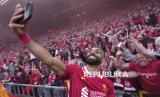 Pemain Liverpool Mohamed Salah merayakan gelar Liga Primer Inggris 2024/2025 bersama fans di Anfield, Ahad (27/4/2025). Liverpool memastikan keluar sebagai juara Liga Primer Inggris 2024/2025 setelah mengalahkan Tottenham Hotspur dengan skor 5-1. Tambahan poin dari kemenangan itu, membuat Liverpool unggul 15 poin dari peringkat kedua Arsenal. Arsenal tidak mungkin mengejar Liverpool karena liga tinggal menyisakan empat laga lagi. Liverpool saat ini menempati peringkat pertama klasemen Liga Inggris 2024-2025 dengan 82 poin, sementara Arsenal baru mengoleksi 67 poin. Gelar Liga Primer Inggris 2024/2025 menjadi gelar ke-20 bagi Liverpool. (FOTO : AP Photo/Jon Super)