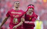 Pemain Liverpool Trent Alexander-Arnold dan Curtis Jones merayakan gelar Liga Primer Inggris 2024/2025 di kandang sendiri, Anfield, Ahad (27/4/2025). Liverpool memastikan keluar sebagai juara Liga Primer Inggris 2024/2025 setelah mengalahkan Tottenham Hotspur dengan skor 5-1. Tambahan poin dari kemenangan itu, membuat Liverpool unggul 15 poin dari peringkat kedua Arsenal. Arsenal tidak mungkin mengejar Liverpool karena liga tinggal menyisakan empat laga lagi. Liverpool saat ini menempati peringkat pertama klasemen Liga Inggris 2024-2025 dengan 82 poin, sementara Arsenal baru mengoleksi 67 poin. Gelar Liga Primer Inggris 2024/2025 menjadi gelar ke-20 bagi Liverpool. (FOTO : AP Photo/Jon Super)