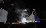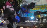 Peserta mengikuti pelatihan Mobile Training Unit (MTU) Bidang Teknik Pengelasan di halaman Kantor Kelurahan Pejaten Timur, Pasar Minggu, Jakarta Selatan, Selasa (29/4/2025). Pelatihan tersebut digelar oleh Pusat Pelatihan Kerja Khusus Pengembangan Las (PPKKPL) Disnakertrans DKI Jakarta secara gratis. Sebanyak 10 peserta mengikuti kegiatan pelatihan teori dan praktik selama 30 hari kerja. Pelatihan tersebut digelar untuk melatih kemampuan angkatan kerja dengan keahlian khusus sehingga diharapkan dapat menekan angka pengangguran di DKI Jakarta. (FOTO : Republika/Thoudy Badai)