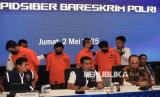 REPUBLIKA.CO.ID, JAKARTA -- Petugas memeriksa barang bukti kasus judi daring saat konferensi pers di Gedung Bareskrim Polri, Jakarta, Jumat (2/5/2025).