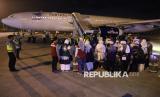 REPUBLIKA.CO.ID, DELI SERDANG -- Jamaah calon haji kelompok terbang (kloter) ketiga Embarkasi Medan bersiap memasuki pesawat di Bandara Internasional Kualanamu, Kabupaten Deli Serdang, Sumatera Utara, Senin (5/5/2025).