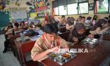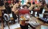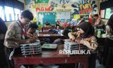Siswa bersiap membagikan makanan saat pelaksanaan program Makan Bergizi Gratis (MBG) di SDN Jati 03, Pulogadung, Jakarta, Rabu (7/5/2025). Dalam kesempatan tersebut Presiden Prabowo Subianto bersama tokoh filantropi dunia sekaligus pendiri Microsoft Bill Gates melihat langsung kualitas dan antusias siswa SDN Jati 03, Pulogadung saat pelaksanaan Program Makan Bergizi Gratis (MBG). (FOTO : Republika/Prayogi)
