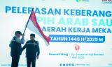 REPUBLIKA.CO.ID, TANGERANG Menteri Agama Nasaruddin Umar menyerahkan bendera Merah Putih kepada Kepala Bidang Pelindungan Jamaah Kolonel Harun Al Rasyid saat pelepasan keberangkatan Panitia Penyelenggara Ibadah Haji (PPIH) ke Tanah Suci di Asrama Haji Cipondoh, Kota Tangerang, Banten, Rabu (7/5/2025).