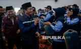Menteri Agama Nasaruddin Umar (kedua kiri) disambut Panitia Penyelenggara Ibadah Haji (PPIH) saat pelepasan keberangkatan di Asrama Haji Cipondoh, Kota Tangerang, Banten, Rabu (7/5/2025). Sebanyak 535 PPIH Arab Saudi untuk daerah kerja Makkah dilepas keberangkatannya usai mengikuti bimbingan teknis pada 4-6 Mei 2025.  (FOTO : ANTARA FOTO/Putra M. Akbar)