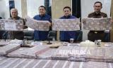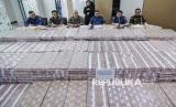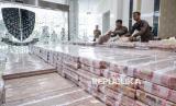 REPUBLIKA.CO.ID, JAKARTA -- Petugas menata barang bukti berupa uang sitaan usai konferensi pers perkembangan penanganan perkara dugaan Tindak Pidana Pencucian Uang (TPPU) dan Tindak Pidana Korupsi (TPK) dalam kegiatan usaha perkebunan kelapa sawit PT Duta Palma Group di Gedung Bundar Jampidsus Kejaksaan Agung, Jakarta, Kamis (8/5/2025).