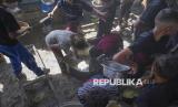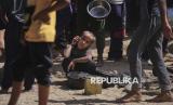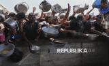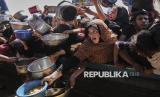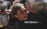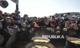 Warga Gaza harus berebut untuk mendapatkan makanan dari dapur umum. Mereka saling berdesakan, berteriak dan menangis sambil berharap memperoleh jatah makan.