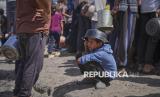 Anak Palestina menangis saat berebut untuk mendapatkan makanan dari dapur umum di Khan Younis, Jalur Gaza, Jumat (9/5/2025). Warga Gaza harus berebut untuk mendapatkan makanan dari dapur umum. Menipisnya pasokan membuat tak semua warga Gaza bisa mendapatkan makanan. Blokade Israel yang terus berlanjut terhadap bantuan kemanusiaan untuk Gaza, membuat dapur umum tutup karena tidak ada pasokan bahan pangan. Bencana kelaparan mengancam ratusan ribu warga Palestina. (FOTO : AP Photo/Abdel Kareem Hana)
