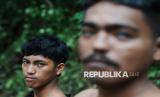 Syawal (kiri) dan Juan (kanan) menunjukkan matanya yang berwarna biru di Kendari, Sulawesi Tenggara, Sabtu (10/5/2025). Keduanya merupakan salah satu dari belasan orang Suku Buton di Sulawesi Tenggara yang memiliki Sindrom Waardenburg yaitu kelainan genetik langka yang menyebabkan mata berwarna biru. (FOTO : ANTARA FOTO/Jojon)