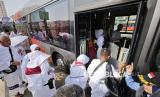 Jamaah calon haji Indonesia menaiki bus Shalawat seusai menunaikan umrah wajib di Masjidil Haram di terminal Syib Amir, Makkah, Arab Saudi, Ahad (11/5/2025). Panitia Penyelenggara Ibadah Haji (PPIH) Arab Saudi telah menyiapkan bus shalawat sebagai moda transportasi jamaah dari hotel ke Masjidil Haram dan sebaliknya yang beroperasi selama 24 jam pada musim haji 2025. Sebanyak 32 unit bus shalawat dengan desain ramah disabilitas dan lansia disiapkan untuk mengantar jamaah haji Indonesia dari hotel ke Masjidil Haram. Layanan ini merupakan bagian dari upaya inklusi yang dilakukan Panitia Penyelenggara Ibadah Haji (PPIH) Arab Saudi tahun ini. (FOTO : ANTARA FOTO/Andika Wahyu)