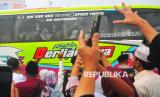Jamaah calon haji melambaikan tangan di dalam bus usai mengikuti pelepasan dan pemberangkatan di halaman Pendopo Kabupaten Kudus, Jawa Tengah, Selasa (13/5/2025). Sebanyak 1.416 calon haji kloter 46, 47, 48, 49, dan 50 dari Kabupaten Kudus diberangkatkan secara bertahap menuju Asrama Haji Donohudan Boyolali dan selanjutnya diterbangkan menuju Tanah Suci. (FOTO : ANTARA FOTO/Yusuf Nugroho)