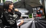 Akademisi Bivitri Susanti menyampaikan orasi saat aksi penolakan rencana pemberian gelar pahlawan untuk Soeharto di depan Kantor Kementerian Sosial, Jakarta, Kamis (15/5/2025). Mereka mendesak pemerintah membatalkan rencana pemberian gelar pahlawan nasional kepada Soeharto. Penolakan ini berdasarkan pada rekam jejak Soeharto selama 32 tahun menjabat sebagai Presiden karena diduga melakukan kekerasan terhadap warga sipil, pelanggaran HAM bahkan pelanggaran berat terhadap HAM, penyalahgunaan wewenang dan kekuasaan, serta praktik korupsi, kolusi, dan nepotisme (KKN). (FOTO : Republika/Prayogi)