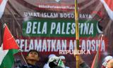REPUBLIKA.CO.ID, BOGOR -- Pengunjuk rasa yang tergabung dalam Majelis Ukhuwah Bogor Raya membawa poster saat Aksi Bela Palestina di kawasan Tugu Kujang, Kota Bogor, Jawa Barat, Jumat (16/5/2025).
