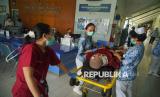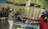 REPUBLIKA.CO.ID, BANTUL -- Petugas kesehatan memberikan pertolongan pertama kepada korban saat simulasi penanganan gempa Megathrust di Rumah Sakit Santa Elisabeth, Bantul, DI Yogyakarta, Sabtu (17/5/2025).