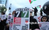 Puluhan massa yang tergabung dalam Solidaritas Seni untuk Palestina menggelar aksi bela Palestina bertepatan dengan 77 tahun Hari Nakba, di Tugu Asia Afrika, Alun-alun Kota Bandung, Sabtu (17/5/2025). Nakba Day adalah peringatan tahunan untuk pengusiran bangsa Palestina yang mendorong terbentuknya Israel pada tahun 1948. Dalam aksi itu, peserta menyerukan agar dunia khususnya Indonesia berperan aktif untuk menyelamatkan warga Gaza dari perang Genosida. (FOTO : Edi Yusuf)
