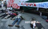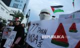 REPUBLIKA.CO.ID, BANDUNG -- Puluhan massa yang tergabung dalam Solidaritas Seni untuk Palestina menggelar aksi bela Palestina bertepatan dengan 77 tahun Hari Nakba, di Tugu Asia Afrika, Alun-alun Kota Bandung, Sabtu (17/5/2025).