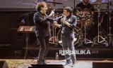 Penampilan vokalis grup musik God Bless Achmad Albar (kiri) saat berkolaborasi dengan penyanyi Ikang Fawzi (kanan) pada konser bertajuk Godbless Unplugged di Balai Sarbini, Jakarta, Sabtu (17/5/2025). Pada konser tersebut, God Bless untuk pertama kalinya dalam 52 tahun karier bermusik menghadirkan aransemen baru dari lagu-lagu lama mereka dengan konsep akustik. (FOTO : ANTARA FOTO/Dhemas Reviyanto)
