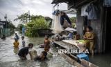 REPUBLIKA.CO.ID, DEMAK -- Sejumlah anak bermain air di dekat rumahnya saat banjir di Dusun Gayang, Desa Karangrejo, Bonang, Kabupaten Demak, Jawa Tengah, Rabu (21/5/2025).