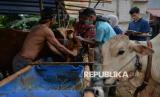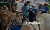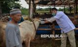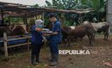 Petugas dari Suku Dinas Ketahanan Pangan Kelautan dan Pertanian (KPKP) Jakarta Selatan melakukan pemeriksaan hewan kurban di salah satu lapak hewan kurban di kawasan Petukangan Utara, Jakarta Selatan, Kamis (22/5/2025). Pemerintah Provinsi DKI Jakarta secara serentak melakukan pemeriksaan kesehatan hewan kurban hingga hari tasyrik sebagai upaya perlindungan bagi warga yang akan menjalankan ibadah kurban. Pemeriksaan tersebut meliputi pengecekan kesehatan pada bagian fisik sapi atau kambing serta melakukan pengambilan sampel darah untuk diuji laboratorium. Langkah tersebut dilakukan untuk memastikan hewan kurban bebas dari penyakit dan layak disembelih. Pemerintah mengimbau kepada pedagang dan masyarakat untuk memastikan hewan kurban yang dibeli telah melewati pemeriksaan kesehatan resmi. (FOTO : Republika/Thoudy Badai)