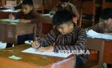 Siswa mengerjakan soal dalam rangkaian ujian sekolah di SDN 1 Depok Trenggalek, Jawa Timur, Kamis (22/5/2025). Sebanyak 28 siswa kelas 6 di sekolah dasar tersebut tetap masuk mengikuti ujian sekolah kendati akses jalan menuju sekolah mereka putus tertimbun longsor sejak Senin (19/5/2025). (FOTO : ANTARA FOTO/Destyan Sujarwoko)