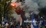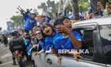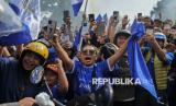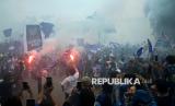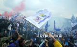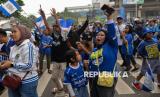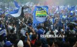 Bobotoh mengikuti pawai bersama pemain dan ofisial Persib Bandung di Kota Bandung, Jawa Barat, Ahad (25/5/2025). Persib Bandung melakukan pawai dari Balai Kota Bandung menuju Gedung Sate untuk merayakan juara Liga 1 musim 2024/2025. Pawai tim berjuluk Maung Bandung itu diikuti puluhan ribu Bobotoh yang memadati sejumlah ruas jalan di Kota Bandung. Setibanya di Gedung Sate, para punggawa Persib Bandung mengangkat piala di atas balkon Gedung Sate. Sejumlah pemain seperti Ciro Alves, Beckham Putra, Marc Klok, dan Gustavo Franca diarak menggunakan sisingaan menuju panggung utama. (FOTO : Republika/Thoudy Badai)