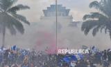 Puluhan ribu Bobotoh memadati halaman Gedung Sate, Kota Bandung, usai pawai perayaan kemenangan Persib Bandung di Liga 1 musim 2024/2025, Ahad (25/5/2025). Persib berhasil mencetak sejarah dengan menjuarai Liga 1 dua musim berturut-turut, setelah sebelumnya meraih gelar juara pada musim 2023/2024. (FOTO : Edi Yusuf)