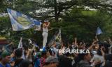 Gubernur Jawa Barat Dedi Mulyadi menyapa para Bobotoh yang memadati halaman Gedung Sate, Kota Bandung, usai pawai perayaan kemenangan Persib Bandung di Liga 1 musim 2024/2025, Ahad (25/5/2025). Persib berhasil mencetak sejarah dengan menjuarai Liga 1 dua musim berturut-turut, setelah sebelumnya meraih gelar juara pada musim 2023/2024. (FOTO : Edi Yusuf)