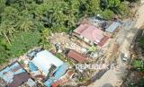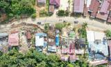 Foto udara bangunan rumah dan masjid rusak yang rusak akibat tanah amblas di kawasan jalan Poros Samarinda-Balikpapan di Desa Batuah, Loa Janan, Kabupaten Kutai Kartanegara, Kalimantan Timur, Ahad (25/5/2025). Menurut Kepala Desa Batuah bahwa tercatat 21 rumah dari 28 Kepala Keluarga (KK) dengan total 88 jiwa serta sebuah masjid yang terdampak akibat amblasnya jalan nasional sepanjang 80 meter. (FOTO : ANTARA FOTO/M Risyal Hidayat)