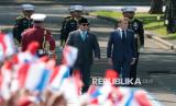 Presiden Prabowo Subianto (kiri) bersama Presiden Prancis Emmanuel Macron memeriksa pasukan saat kunjungan kenegaraan di Istana Merdeka, Jakarta, Rabu (28/5/2025). Kunjungan kenegaraan Presiden Prancis tersebut untuk mempererat dan meningkatkan hubungan bilateral di berbagai bidang strategis antara Indonesia dengan Prancis. (FOTO : AP Photo/Achmad Ibrahim)