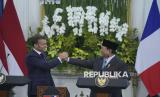 REPUBLIKA.CO.ID, JAKARTA -- Presiden Prabowo Subianto menggenggam tangan Presiden Prancis Emmanuel Macron saat bertemu di Istana Merdeka, Jakarta, Rabu (28/5/2025).