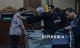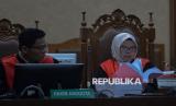 Ketua Majelis Hakim membaca berkas tuntutan tiga terdakwa kasus dugaan suap vonis bebas terhadap Gregorius Ronald Tannur dalam sidang tuntutan di Pengadilan Tipikor, Jakarta, Rabu (28/5/2025). Dalam sidang tersebut, jaksa penuntut umum (JPU) menjatuhkan tuntutan kepada mantan pejabat Mahkamah Agung (MA) Zarof Ricar pidana penjara 20 tahun membayar denda Rp1 miliar, ibunda Ronald Tannur Meirizka Widjaja dengan pidana penjara empat tahun dan denda Rp750 juta dan pengacara Gregorius Ronald Tannur, Lisa Rachmat penjara selama 14 tahun dan membayar denda Rp750 juta. (FOTO : Republika/Thoudy Badai)