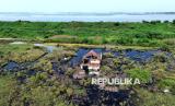 Foto udara sebuah rumah rusak di pinggir kolam penampungan semburan lumpur Lapindo di Porong, Sidoarjo, Jawa Timur, Kamis (29/5/2025). Bencana semburan lumpur panas Lapindo terjadi 19 tahun lalu tepatnya pada 29 Mei 2006. Akibar peristiwa itu, desa-desa tenggelam dan ribuan rumah rusak. Fasilitas pendidikan, tempat ibadah, dan infrastruktur lainnya juga hilang. Hingga saat ini semburan lumpur Lapindo masih aktif mengeluarkan lumpur panas dari dalam bumi. (FOTO : ANTARA FOTO/Umarul Faruq)