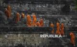 Biksu berada di Candi Borobudur saat kunjungan Presiden Prabowo Subianto bersama Presiden Prancis Emmanuel Macron di Candi Borobudur, Kabupaten Magelang, Jawa Tengah, Kamis (29/5/2025). Dalam kunjungan di candi yang dibangun pada 750-850 Masehi oleh Dinasti Syailendra dari Kerajaan Mataram Kuno tersebut keduanya menyampaikan sejumlah kesepakatan antarkedua negara. (FOTO : Yasuyoshi Chiba/Pool Photo via AP)