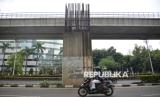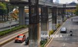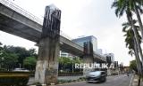 Sejumlah kendaraan melintas di dekat tiang monorel yang terhenti pembangunannya di Jalan Rasuna Said, Jakarta, Kamis (29/5/2025). Gubernur DKI Jakarta Pramono Anung menyatakan komitmennya untuk menyelesaikan persoalan tiang-tiang monorel yang terbengkalai di sejumlah ruas jalan ibu kota. Menurutnya, keberadaan tiang-tiang beton yang tersebar di Jalan HR Rasuna Said, Kuningan, hingga kawasan Senayan, Jakarta Selatan, telah merusak wajah kota. (FOTO : Republika/Prayogi)