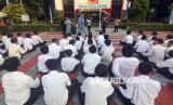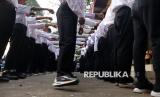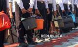 REPUBLIKA.CO.ID, DEPOK -- Peserta program Pembinaan Karakter dan Bela Negara berbaris di Balai Kota, Depok, Jawa Barat, Sabtu (31/5/2025).
