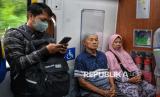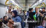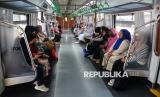 Sejumlah penumpang berada didalam rangkaian KRL baru CLI-125 di jalur Jakarta Kota- Bogor, Ahad (1/6/2025). KAI Commuter mulai mengoperasikan KRL Commuter Line baru CLI-125 sekaligus resmi mengangkut penumpang. Sejauh ini ada 3 trainset atau rangkaian baru CLI-125 dengan formasi 12 gerbong yang mulai operasi hari ini. Ada 2 trainset yang beroperasi di jalur Bogor dan 1 trainset jalur Cikarang. Adapun daya tampung 1 gerbong kereta CLI-125 mencapai 289 orang, sementara itu 1 rangkaian dengan 12 gerbong mencapai 3.400 penumpang sekali jalan. Pengoperasian KRL baru ini sebagai bentuk komitmen KAI Commuter dalam meningkatkan pelayanan transportasi commuter yang aman, nyaman, dan andal bagi masyarakat. (FOTO : Republika/Prayogi)