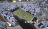 Umat Islam membaca alquran digital jelang wukuf di Arafah, Arab Saudi, Kamis (5/6/2025). Sekitar 1,83 juta muslim dari berbagai penjuru dunia termasuk dari Indonesia yang tahun ini memiliki kuota sebanyak 221.000 jamaah berkumpul di Arafah untuk melaksanakan wukuf yang merupakan rukun haji pada prosesi puncak ibadah haji 1446 H. (FOTO : AP Photo/Amr Nabil)