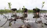 Mahasiswa menanam mangrove di Pesisir Danau Siombak, Medan Marelan, Medan, Sumatera Utara, Kamis (5/6/2025). Pemerintah Kota Medan bersama organisasi lingkungan dan mahasiswa melakukan aksi pembersihan danau sekaligus penanaman mangrove dalam rangka memperingati Hari Lingkungan Hidup Sedunia. (FOTO : ANTARA FOTO/Yudi Manar)