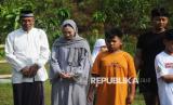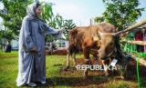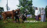 Ketua Umum Yayasan Mochamad Thohir Giovanna Thohir saat meninjau hewan kurban di lokasi penyembelihan hewan kurban Masjid At-Thohir, Depok, Jawa Barat, Jumat (6/6/2025). Tahun ini, panitia kurban Masjid At-Thohir menyembelih 7 ekor sapi dan 18 ekor domba/kambing. Selanjutnya, daging kurban akan didistribusikan kepada warga, panti asuhan, serta lembaga sosial di sekitar lingkungan masjid. (FOTO : Republika/Prayogi)