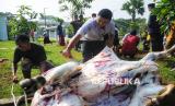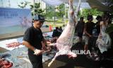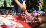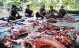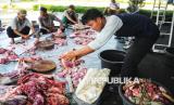 Panitia memotong daging hewan kurban di Masjid At-Thohir, Depok, Jawa Barat, Jumat (6/6/2025). Tahun ini, panitia kurban Masjid At-Thohir menyembelih 7 ekor sapi dan 18 ekor domba/kambing. Selanjutnya, daging kurban akan didistribusikan kepada warga, panti asuhan, serta lembaga sosial di sekitar lingkungan masjid. (FOTO : Republika/Prayogi)