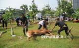 Panitia bersiap menyembelih hewan kurban di Masjid At-Thohir, Depok, Jawa Barat, Jumat (6/6/2025). Tahun ini, panitia kurban Masjid At-Thohir menyembelih 7 ekor sapi dan 18 ekor domba/kambing. Selanjutnya, daging kurban akan didistribusikan kepada warga, panti asuhan, serta lembaga sosial di sekitar lingkungan masjid. (FOTO : Republika/Prayogi)