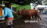 Petugas Rumah Pemotongan Hewan (RPH) membawa sapi kurban dari Presiden RI Prabowo Subianto, di RPH Ciroyom, Sabtu (7/6/2025). Sapi jenis simmental seberat 1,2 ton ini dipotong langsung oleh Wakil Wali Kota Bandung Erwin. Selanjutnya daging kurban disalurkan ke masyarakat melalui DKM Masjid Al Ukhuwah Kota Bandung. (FOTO : Edi Yusuf)
