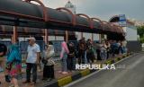 REPUBLIKA.CO.ID, JAKARTA -- Penumpang menaiki bus Transjakarta P11 rute TransJabodetabek Blok M-Bogor di Terminal Blok M, Jakarta, Senin (9/6/2025).