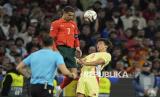 Pemain Portugal Cristiano Ronaldo berduel udara dengan pemain Spanyol pada pertandingan final kejuaraan UEFA Nations League di Allianz Arena, Munich, Jerman, Senin (9/6/2025) dini hari WIB. Portugal meraih gelar kedua di UEFA Nations League dengan mengalahkan juara bertahan Spanyol. Selecao das Quinas menang 5-3 melalui adu penalti. Pada pertandingan itu Ronaldo mencetak satu gol di menit ke-61. (FOTO : AP Photo/Martin Meissner)